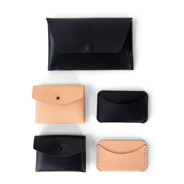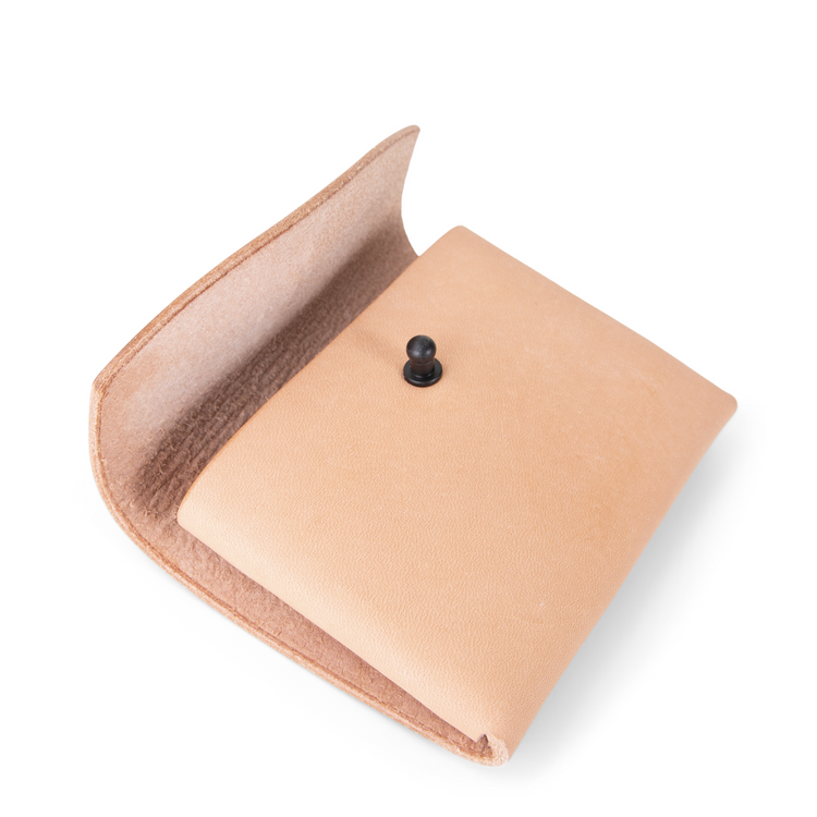 A beautifully minimal design, stitched from one complete piece of full grain leather with a few hand stitches and a matte black collar button. Designed for a stack of cards, mad money or loose change and receipts that build up in well used bags.
