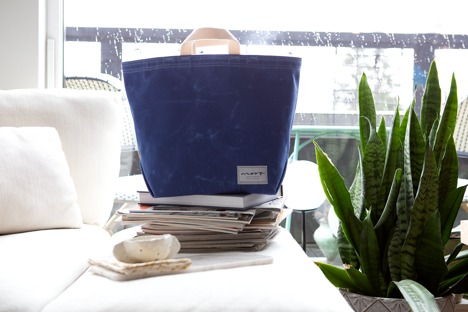 A super useful heavy waxed canvas tote with a structure all its own. We're using this for every utilitarian function we can think of. Made from heavy waxed canvas so the bag stands up on its own. We have one at the end of the couch full of bag blankets, one that we're carrying to and from the grocery store, farmers markets, soccer games and every other thing we do out in the world. We are social creatures and will do anything to be with friends. We love packing this bag full of picnic supplies and riding our bikes to the shores of Lake Washington. We've redesigned it with four interior slip pockets for organization, keeping wine bottles upright and thermoses from tipping over. Now lined in cordura nylon, making it very easy to wipe out the inside and easily dump out beach sand.