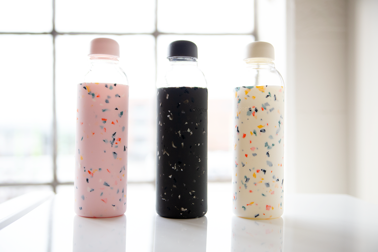 We carry water with us everywhere. Just about every bag we make has a pocket that will hold a thermos so you are never left without. We love this one because drinking water from a glass, on the go, makes us feel extra virtuous. Plus, it's pretty.